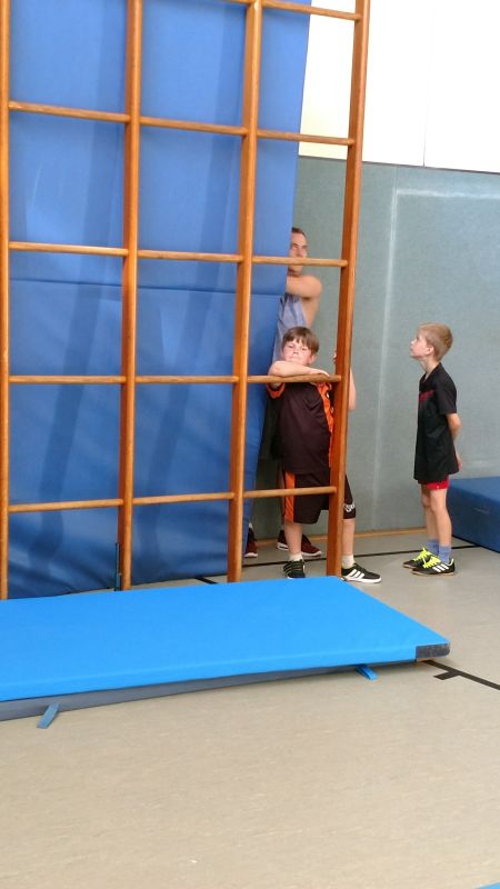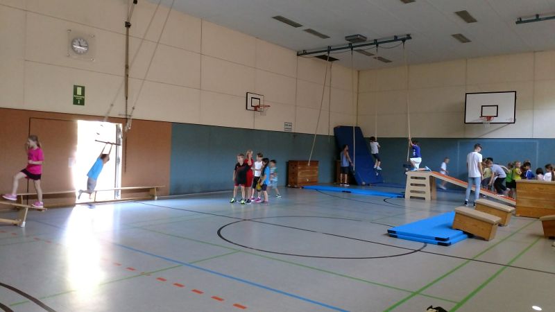 Am Dienstag haben wir zunächst alle zusammen gefrühstückt. Eine gute Stärkung war nötig, denn nach dem Frühstück kam der TSV Bayer zu uns, um einen Ninja Warrior Tag zu veranstalten. Die Turnhalle bebte und alle Kinder konnten sich mächtig auspowern.